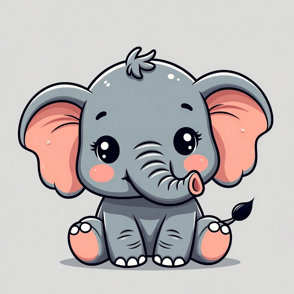 adorable animal, animal illustration, baby elephant, big eyes, cartoon elephant, chibi elephant, clipart, elephant illustration, elephant trunk, gray elephant, isolated background, kawaii elephant, pink ears, sitting elephant, vector art, cute elephant