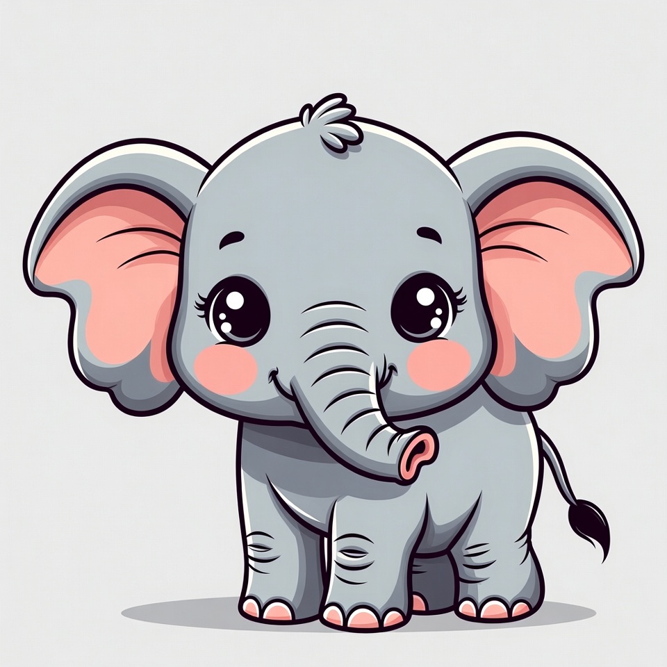 adorable animal, animal illustration, big eyes, cartoon elephant, chibi elephant, children's illustration, clipart, cute elephant, elephant illustration, gray elephant, isolated background, kawaii elephant, pink ears, vector art, baby elephant