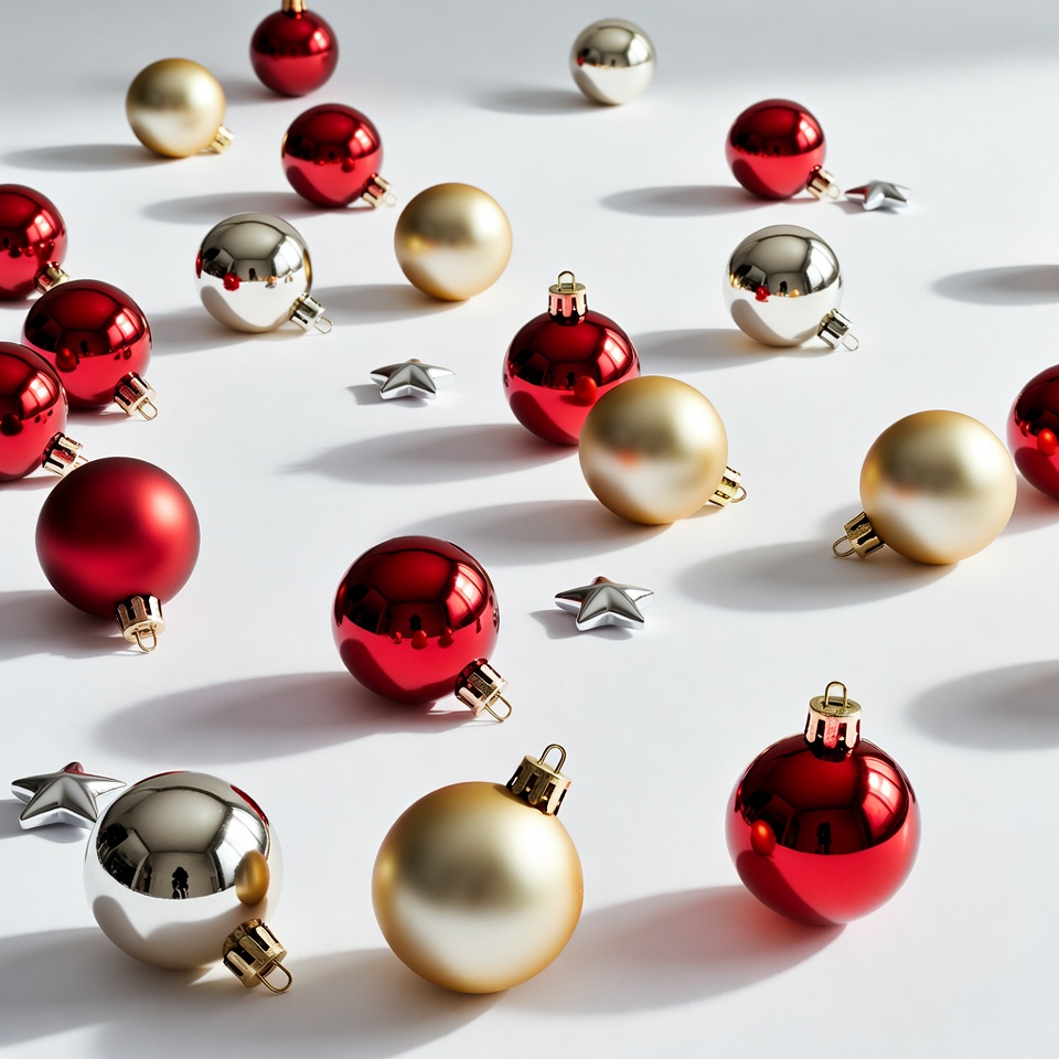 A collection of shiny red, gold, and silver Christmas baubles scattered across a white surface. Small silver stars are placed among the round ornaments. Shadows from the balls add depth to the flat background.