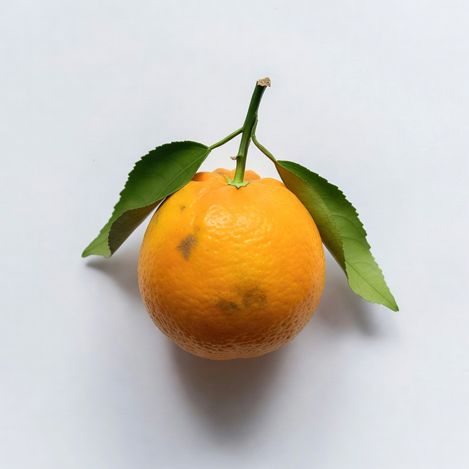 A fresh orange with vibrant orange peel sits on a white background. It has a short green stem and two green leaves attached. The orange shows a small blemish on its skin.