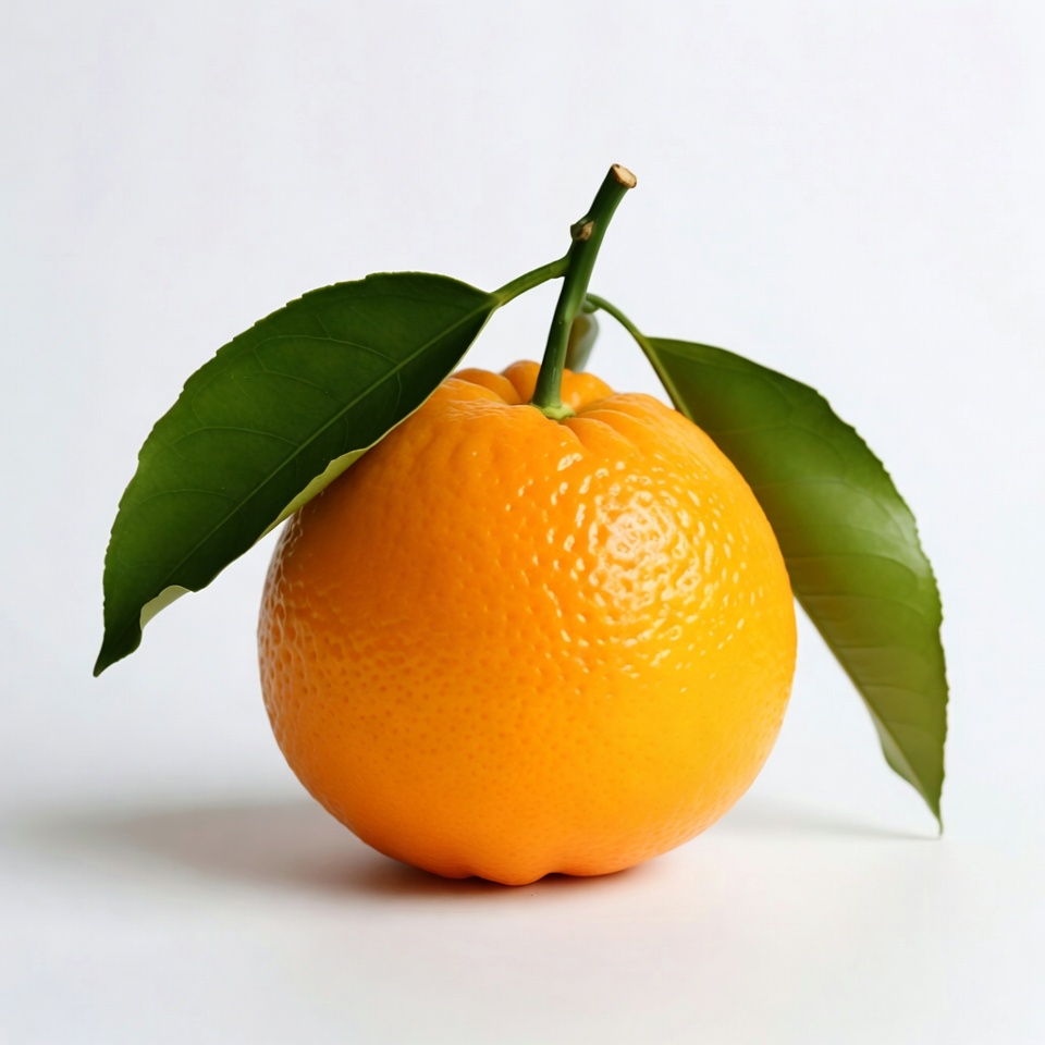 A vibrant orange fruit with textured skin sits against a plain white background. It has a short green stem and two fresh green leaves attached. The orange is centered and brightly lit to highlight its juicy appearance.