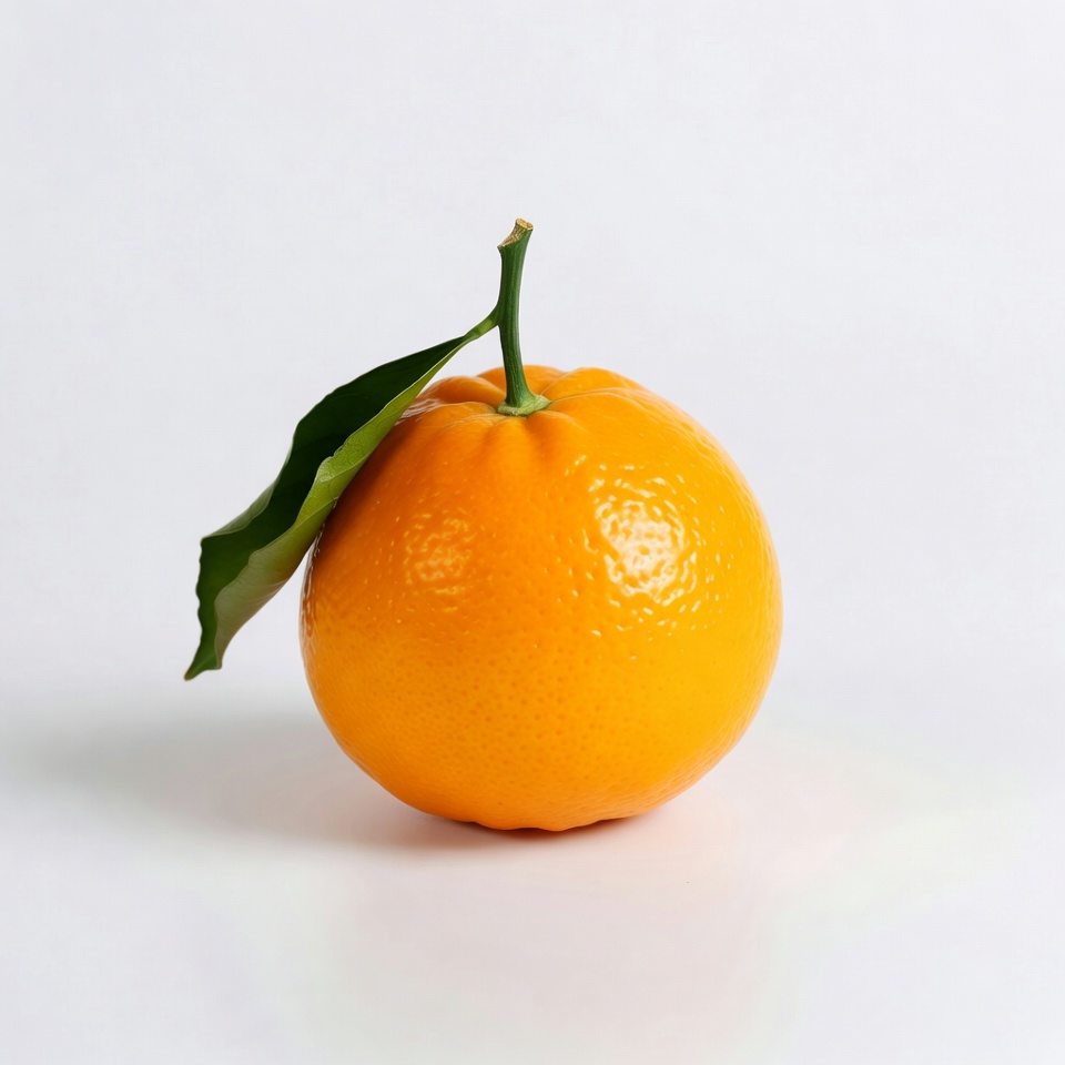 A fresh orange fruit with vibrant orange peel and textured skin sits on a white background. A single green leaf attaches to its short stem. The orange is centered and isolated against the plain white surface.