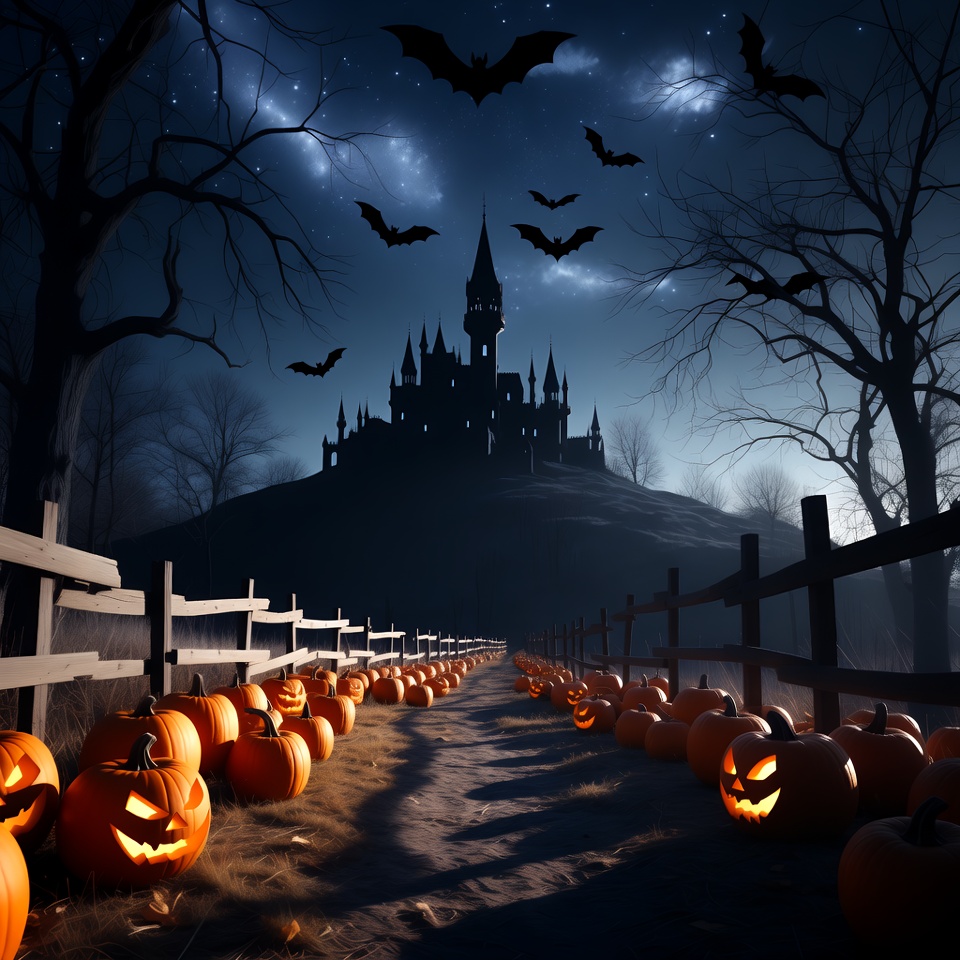A winding dirt path lined with glowing jack-o-lantern pumpkins leads to a dark, spooky castle on a hill under a starry night sky. Swarms of bats fly around the tall, turreted castle silhouetted against bare trees. A wooden fence borders the path in a foggy, eerie landscape.