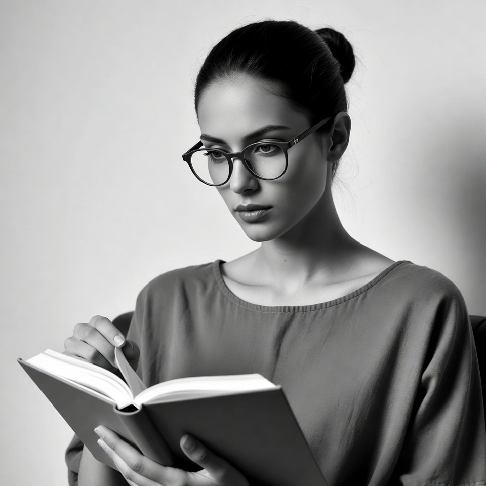 A young woman with dark hair in a bun wears black-framed glasses and reads an open book. She has a thoughtful expression and is dressed in a loose gray top while seated against a white background. Her fingers gently hold the pages of the book.