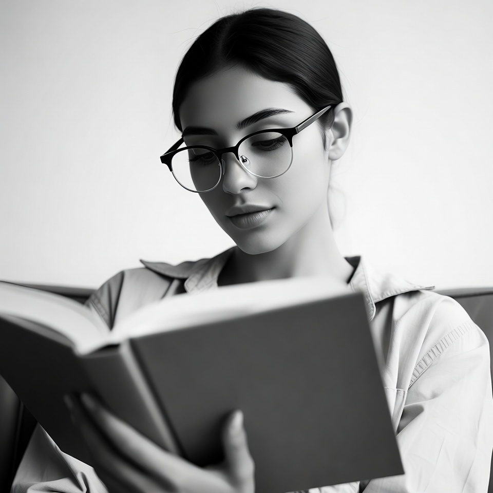 A young woman with dark hair tied back wears stylish glasses and reads an open book attentively. She is dressed in a light-colored collared shirt and sits on a couch. The image is in black and white with a plain background.