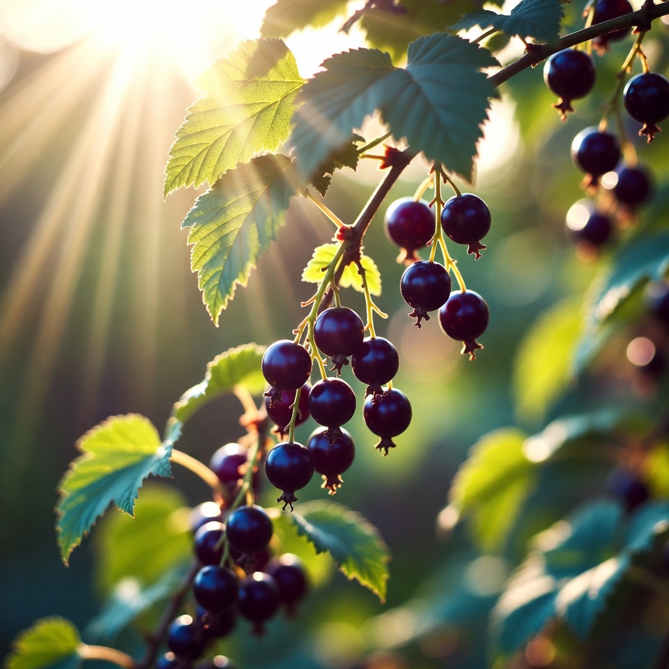Clusters of ripe black currants hang from green leaves on a branch. Sunlight filters through the foliage, creating a glowing backlight effect. The berries are dark purple and glossy against the vibrant green leaves.