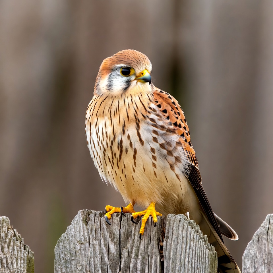 bird, birdwatching, black mask, blurred background, brown bird, falcon, feathers, fence, kestrel, nature, outdoor, perched, raptor, spotted feathers, wild bird, wildlife, wooden post, yellow beak, yellow eyes, yellow feet, American kestrel