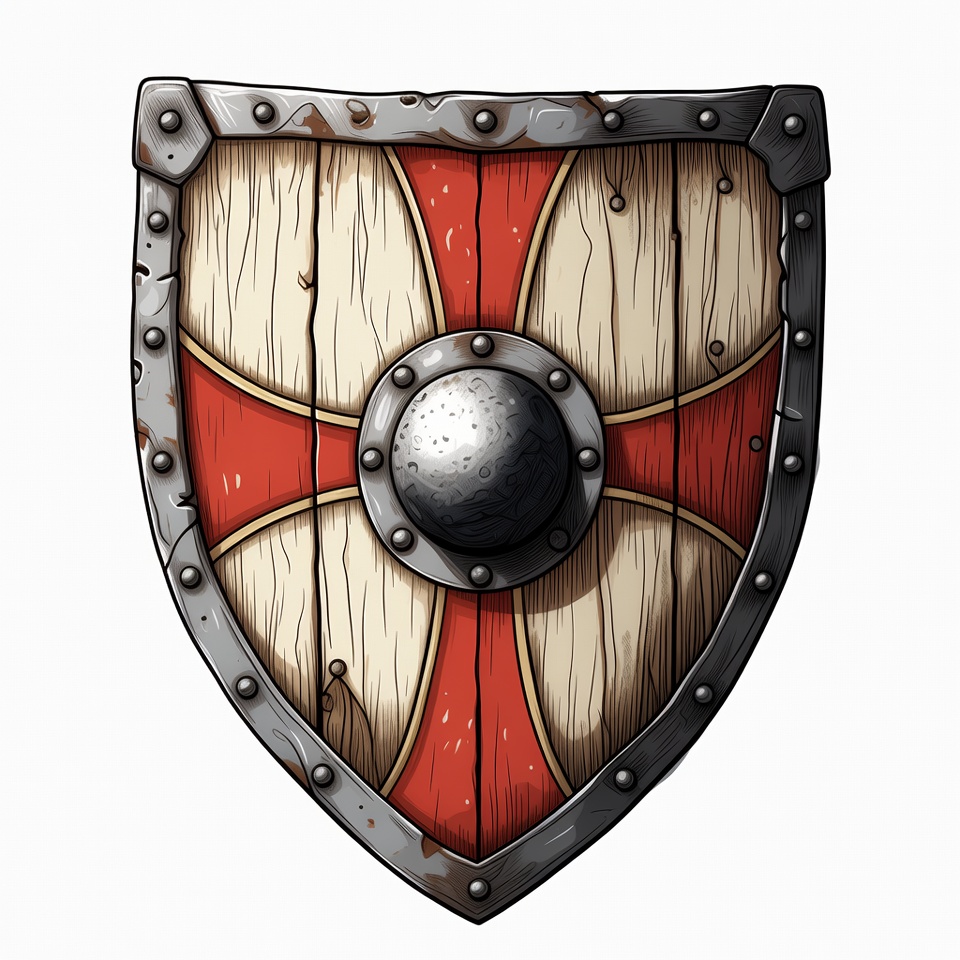 armor, battle shield, clipart, crusader shield, fantasy shield, heraldry, illustration, isolated background, knight shield, medieval shield, metal boss, red cross, vintage shield, wooden shield, shield