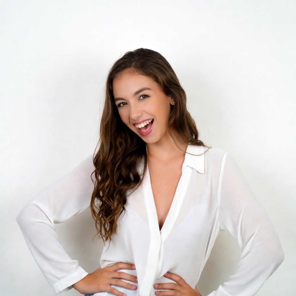 A young woman with long wavy brown hair stands against a white background, wearing a sheer white collared blouse with a deep V-neck. She smiles widely with her tongue slightly out and places both hands on her hips in a confident pose. Her expression is joyful and engaging.