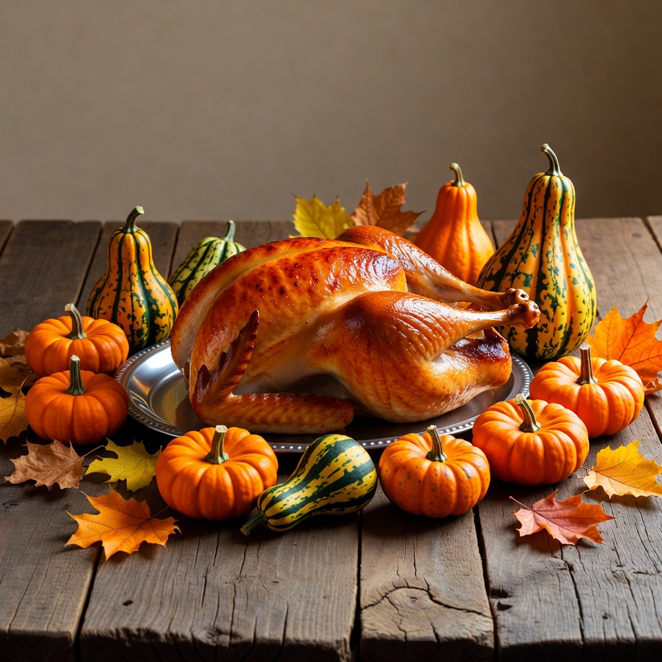 A whole roasted turkey sits on a silver platter on a wooden table, surrounded by assorted pumpkins including orange, white, and striped varieties. Golden autumn leaves are scattered around the arrangement. The turkey is golden-brown and glossy, centered in the festive Thanksgiving display.