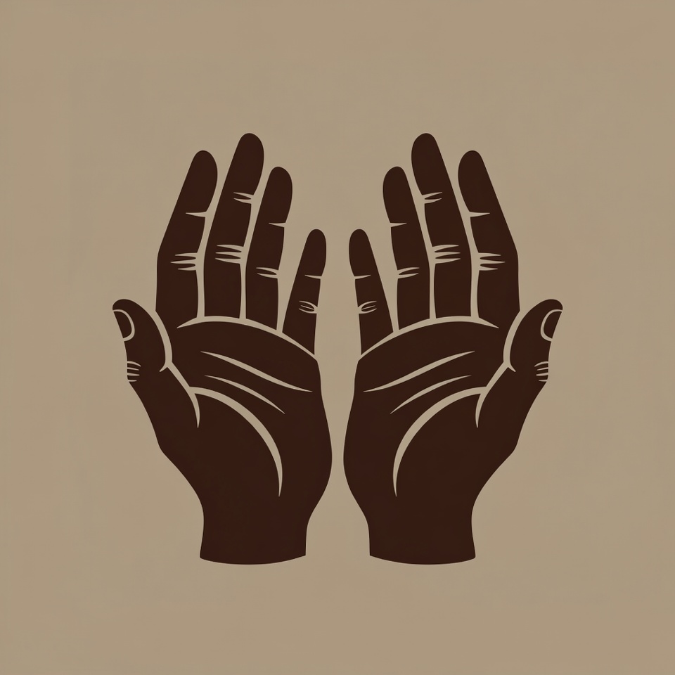 A simple vector illustration depicts two open human hands facing each other. The hands are rendered in dark brown on a light beige background. The design features clean lines and a flat, graphic style.