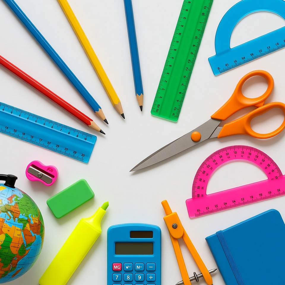Various colorful school supplies are arranged in a circular pattern on a white background. The collection includes pencils, pens, rulers, scissors, a calculator, protractor, compass, eraser, sharpener, highlighter, globe, and notebook. Each item is brightly colored and positioned radially around the center.