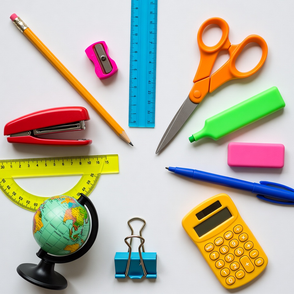 Various school supplies are arranged in a circular pattern on a white background. Items include colored pencils, ruler, scissors, stapler, eraser, sharpener, highlighter, calculator, protractor, globe, and paper clips. The supplies feature vibrant colors like orange scissors, blue ruler, yellow calculator, and green marker.