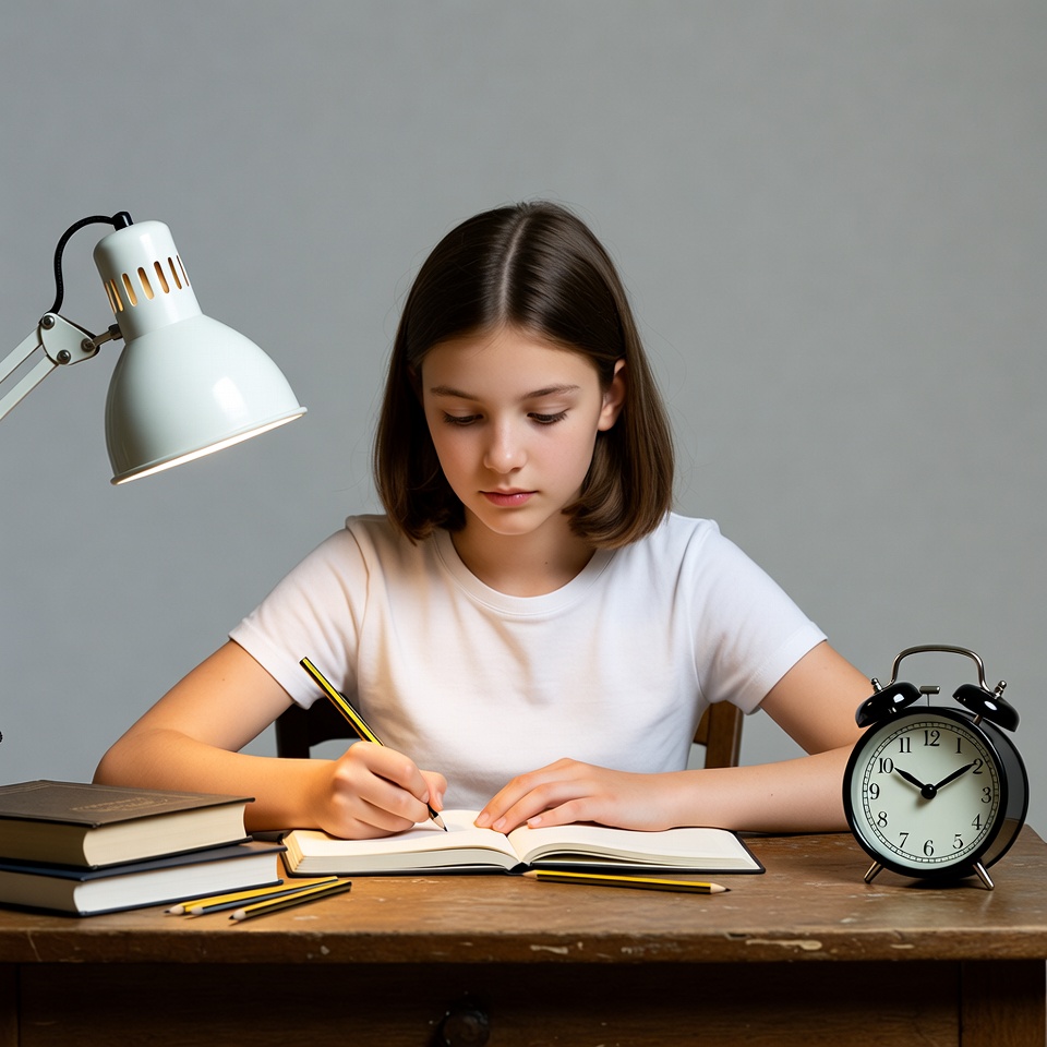 A young girl with straight brown hair sits at a wooden desk, writing in an open notebook with a yellow pencil. She wears a white t-shirt and is focused on her work under a white desk lamp, with books, pencils, and an alarm clock nearby. The background is plain gray.
