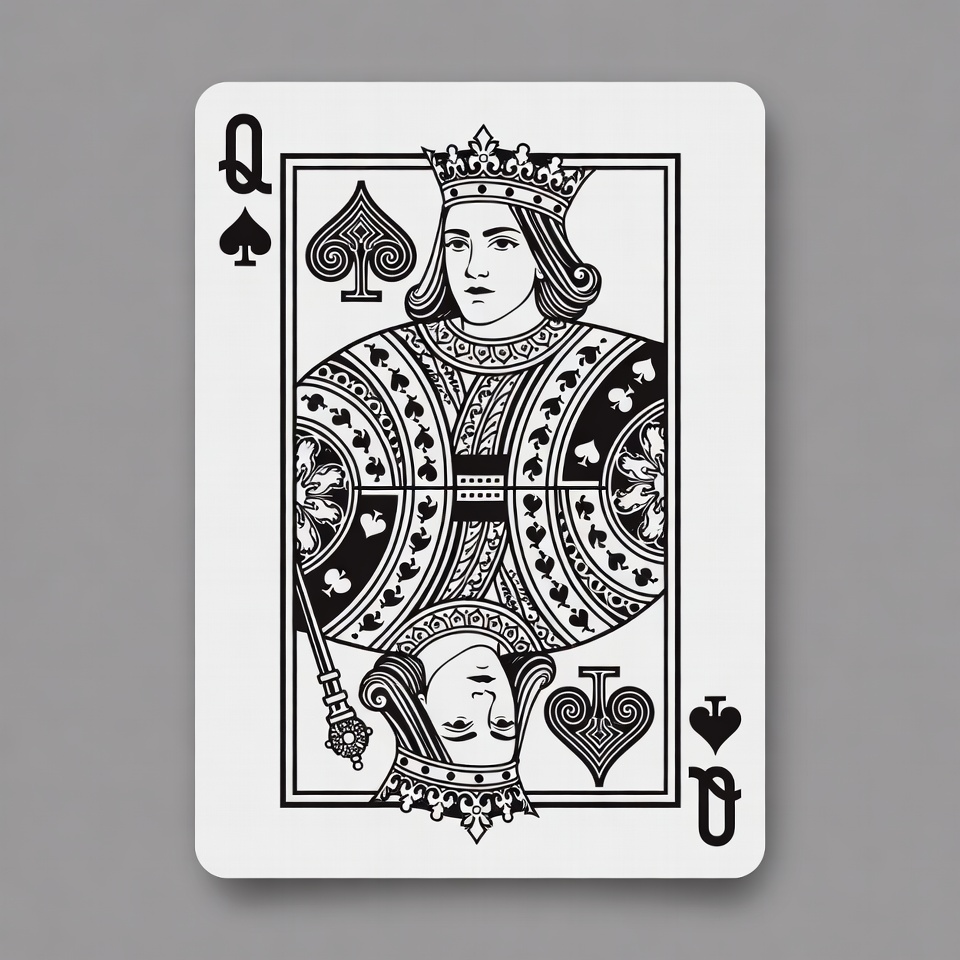 A classic black and white Queen of Spades playing card features an illustrated queen with a crown and ornate robes. She holds a scepter and faces forward on the top half, with her mirrored profile on the bottom half. Spade symbols and the 'Qâ™ ' designation appear in the corners on a white background.