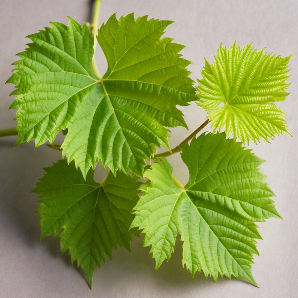 Several vibrant green grape leaves with serrated edges grow from a thin stem. The leaves display detailed veining and are positioned against a plain light gray background. The foliage appears fresh and isolated for close-up viewing.