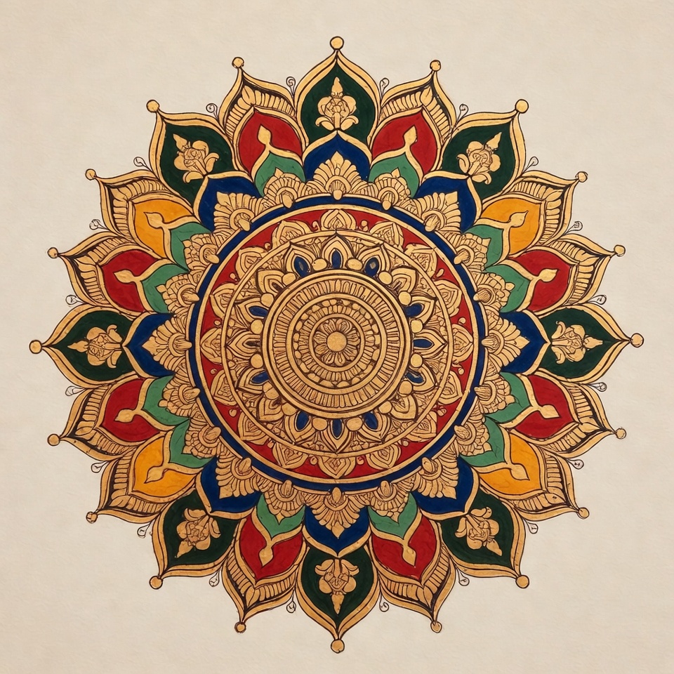 A symmetrical mandala illustration features intricate floral and geometric patterns in vibrant colors. The design centers on a golden core surrounded by red, green, blue, and yellow petals and leaves. It is presented on a plain white background.