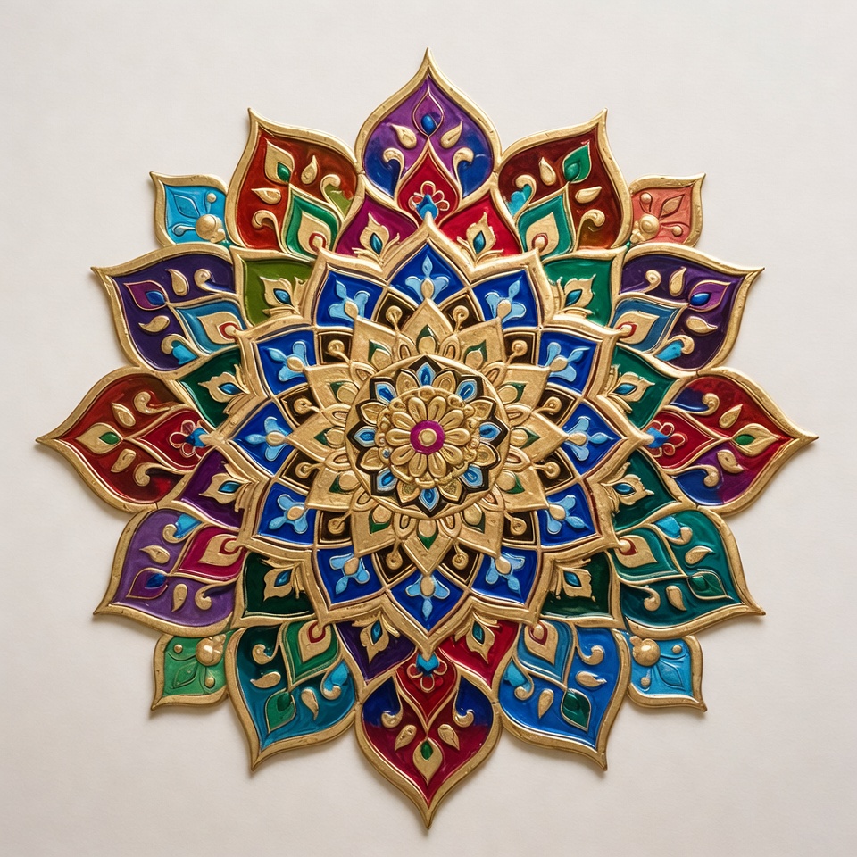 Indian art, art illustration, blue accents, colorful mandala, decorative motif, ethnic artwork, floral mandala, gold mandala, gold outlines, green details, intricate design, isolated background, lotus design, meditation art, purple hues, rangoli pattern, red petals, sacred geometry, spiritual symbol, symmetric pattern, vibrant colors, mandala