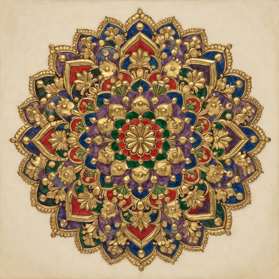 artistic illustration, blue colors, colorful mandala, decorative pattern, floral motif, geometric art, gold mandala, green elements, henna style, indian art, intricate pattern, ornate design, purple details, rangoli design, red accents, sacred geometry, spiritual symbol, symmetrical design, white background, mandala