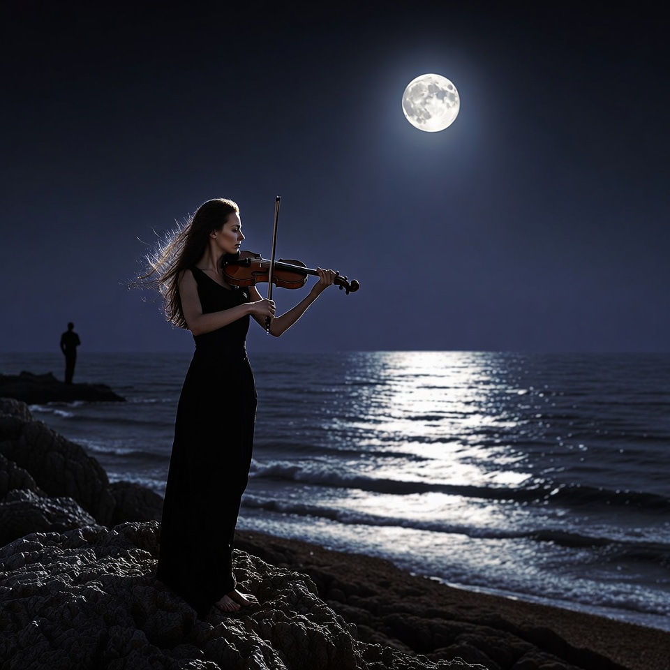 A woman with long flowing hair stands barefoot on rocks by the ocean, playing a violin under a large full moon. She wears a long black dress that billows slightly in the wind. A distant silhouetted man stands on the shore behind her as moonlight reflects on the water.