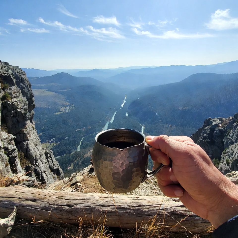 A hand holds a hammered copper mug filled with coffee, extended over a rocky cliff edge. Below stretches a vast panoramic view of layered blue mountains, a winding river valley, and dense green forests under a clear blue sky with scattered clouds. Dry grass and a wooden log frame the foreground.