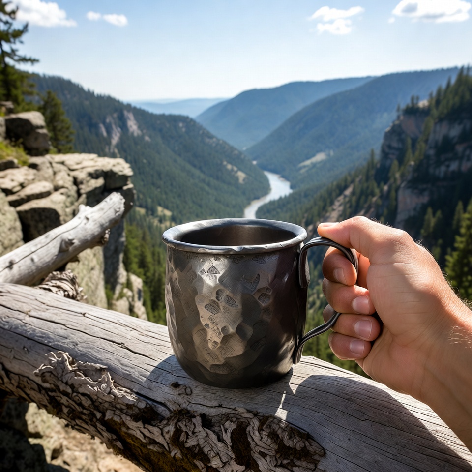 adventure, blue sky, canyon, cliff edge, coffee mug, dramatic view, forest, hammered mug, hiking, landscape, metal mug, mountain view, mountains, mug, nature, outdoor, overlook, pine trees, river, rocky cliff, scenery, sunny day, valley, wilderness, wooden log, hand