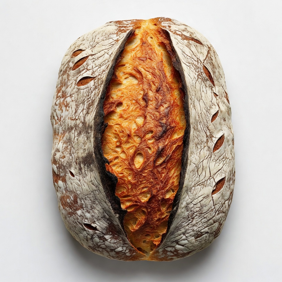 artisan bread, baked goods, bakery, baking, bread slice, bread texture, crusty bread, flour dusted, food photography, fresh bread, golden crumb, homemade bread, loaf, oval loaf, rustic bread, scored crust, sliced bread, sourdough, wheat bread, white background, bread