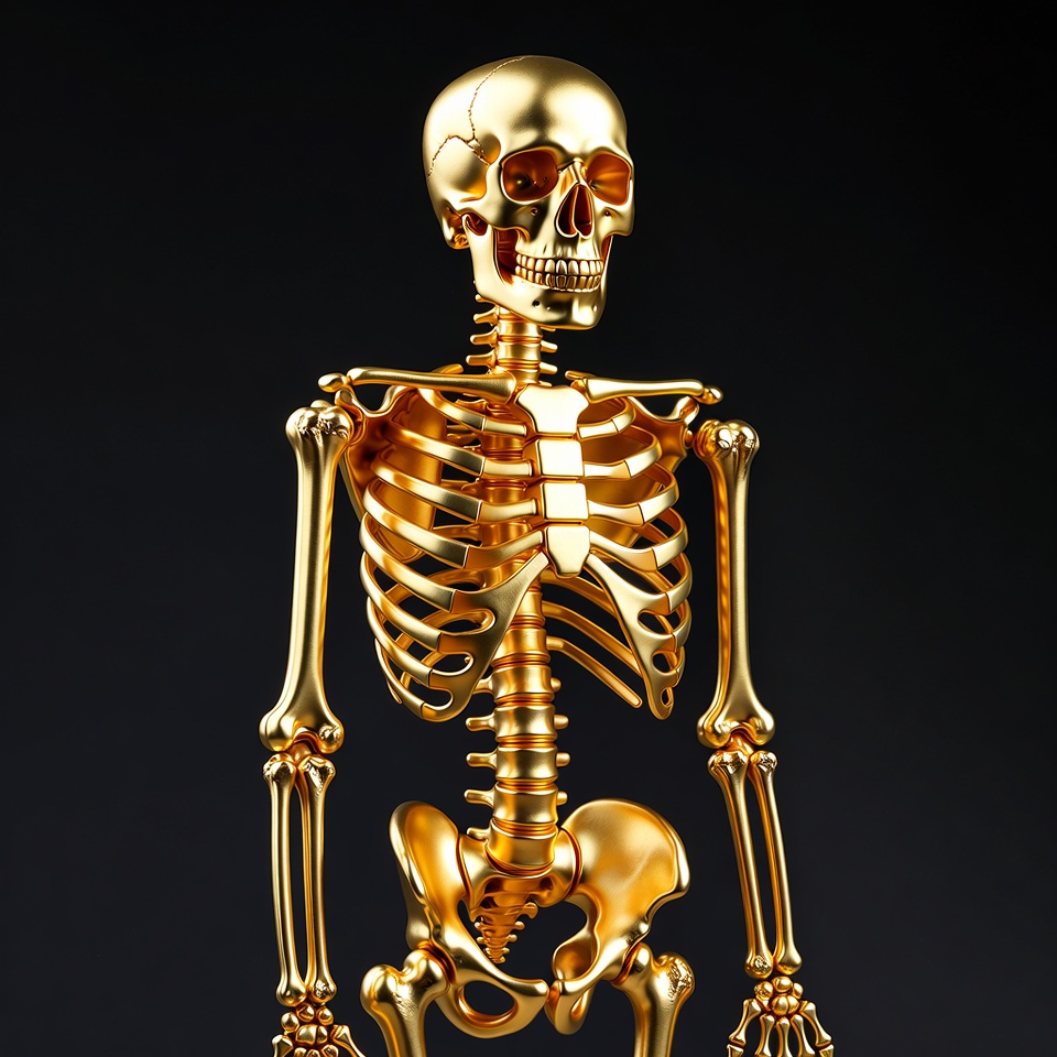 3D render, Halloween, anatomy, black background, bones, gold, human skeleton, isolated background, metallic skeleton, ribcage, shiny gold, skeleton, skull, spine, standing skeleton, golden skeleton