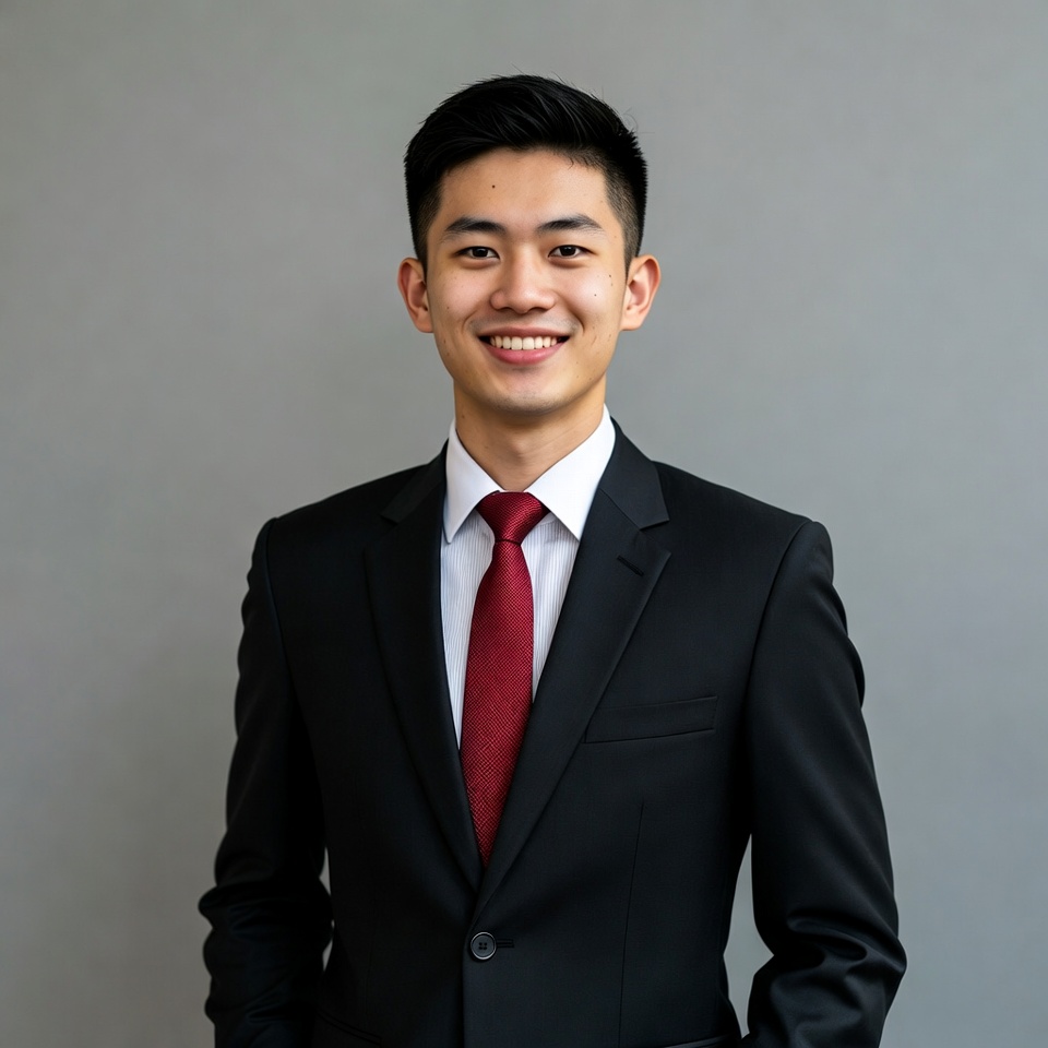 A young Asian man with short black hair smiles confidently at the camera. He wears a black suit, white dress shirt, and red tie, standing against a plain gray background. His posture is professional with hands at his sides.