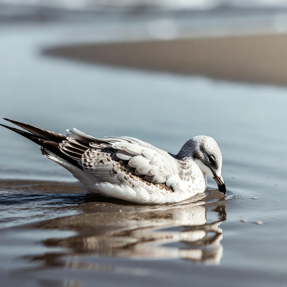 beach, bird, bird reflection, coastal bird, grey seagull, nature, ocean bird, sand, shallow water, shore, standing bird, water, waves, white seagull, wildlife, seagull