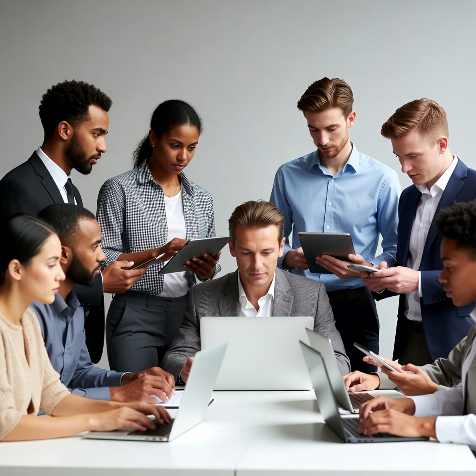 A diverse group of professionals, including African-American, Asian, and White men and women, stands around a table working on laptops and tablets. They are dressed in business attire such as suits, shirts, and blazers. Several hold devices while others type on open laptops in a modern office setting.