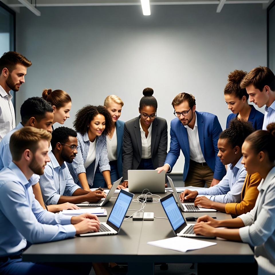 A diverse group of professionals, including men and women of various ethnicities, gathers around a conference table in a modern office. They are working on multiple laptops, with some standing and pointing at screens during a collaborative discussion. The setting features a gray table, white walls, and overhead lighting.