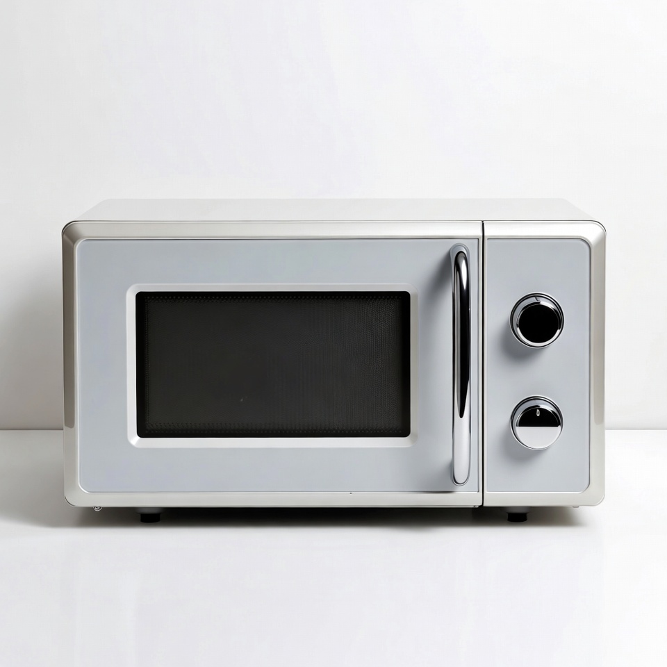 A modern silver microwave oven with a black door window and chrome handle sits on a white surface against a plain white background. It features control knobs and a sleek, rounded design. The appliance is isolated for clear viewing.