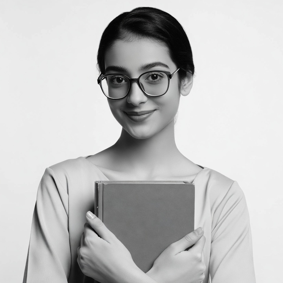 A young Asian woman with dark hair tied back wears glasses and a light-colored top. She holds a thick book against her chest and smiles gently at the camera. The image is a black and white portrait on a plain white background.