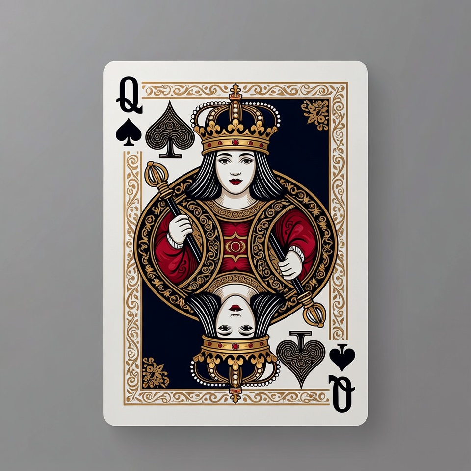 Asian woman, black background, card design, casino card, crown, deck of cards, face backward, face forward, gambling card, gold borders, illustration, isolated background, ornate, playing card, poker card, queen, red gown, scepter, spades suit, symmetrical, queen of spades