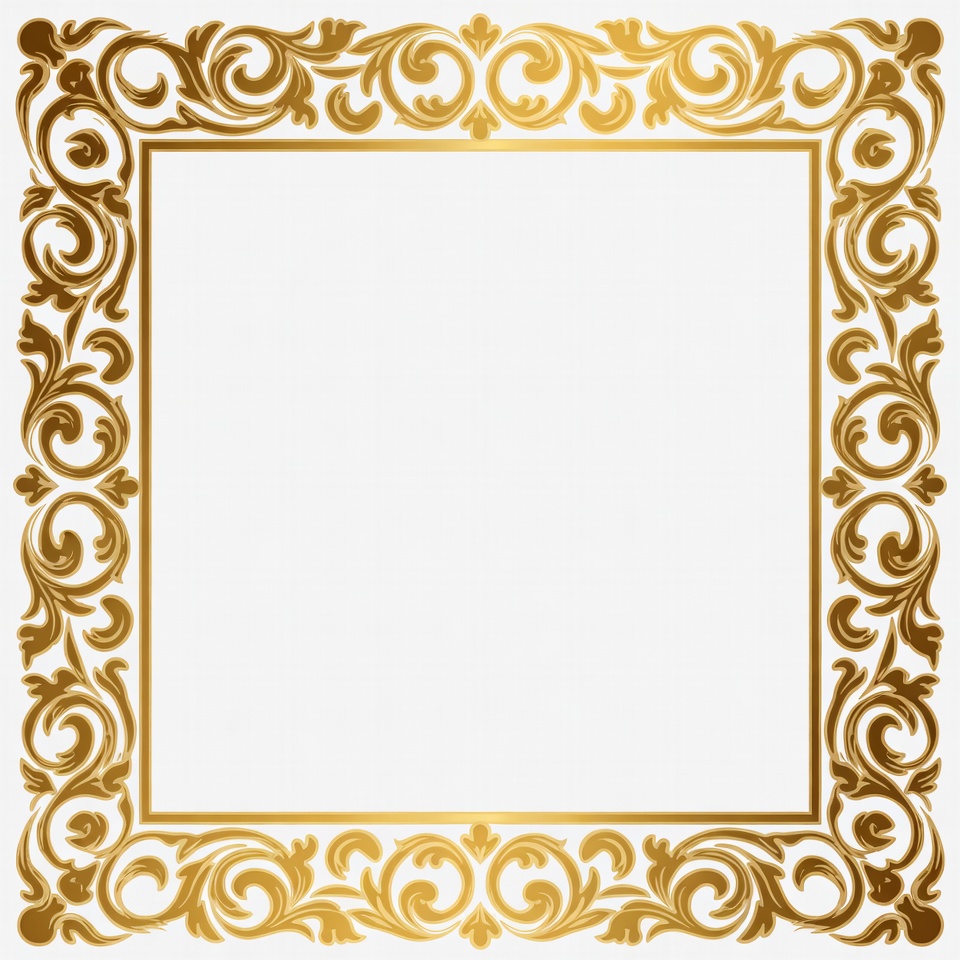 baroque frame, clipart, decorative frame, elegant frame, filigree design, floral border, golden filigree, illustration, isolated background, leaf motifs, ornate frame, square frame, swirling vines, vintage border, white background, gold frame