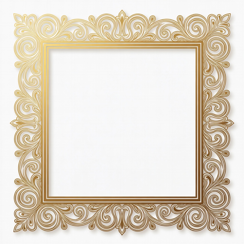 An intricate gold-colored ornamental frame with elaborate floral and scroll designs surrounds a large empty white square. The border features symmetrical swirling patterns and detailed filigree work. It is isolated on a transparent background.
