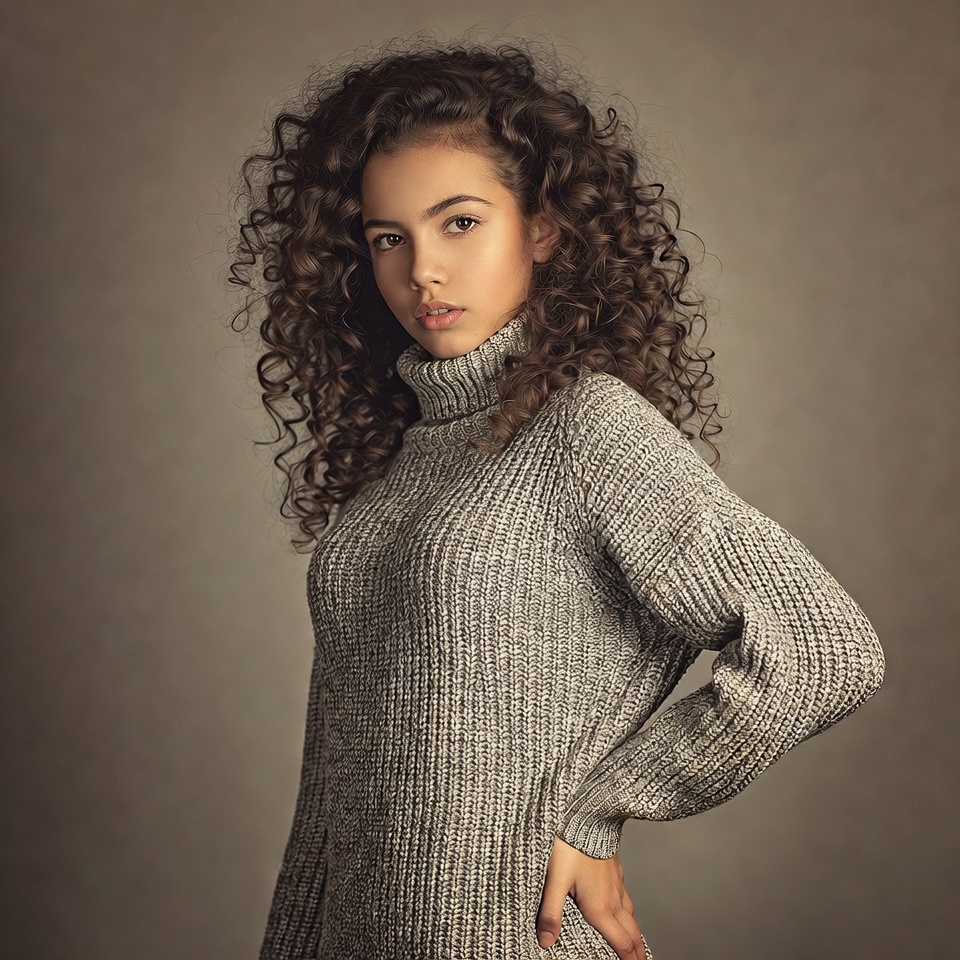 A young girl with long curly brown hair stands against a neutral background wearing a fitted gray turtleneck sweater. She poses with hands behind her back, looking slightly to the side with a subtle expression. Her curls cascade over her shoulders.