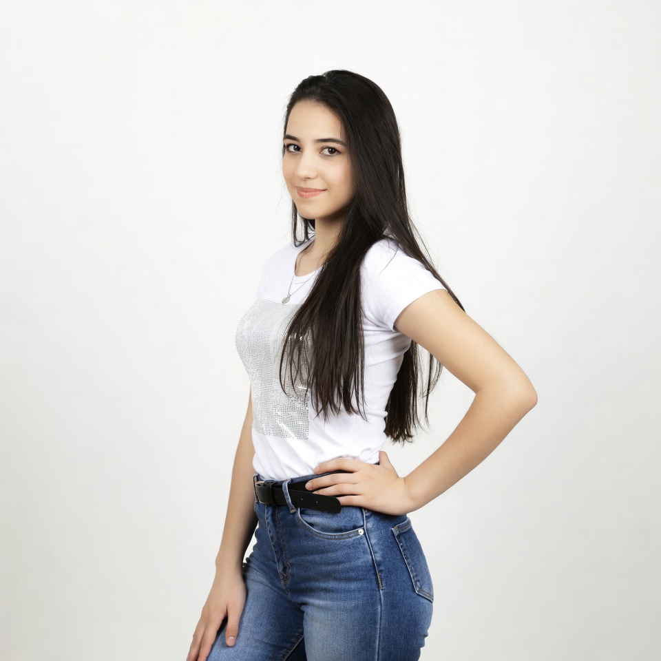 Middle Eastern, black belt, blue jeans, casual outfit, confident pose, dark hair, female, hands on hips, long hair, portrait, posing, smiling, white background, white t-shirt, young woman, woman