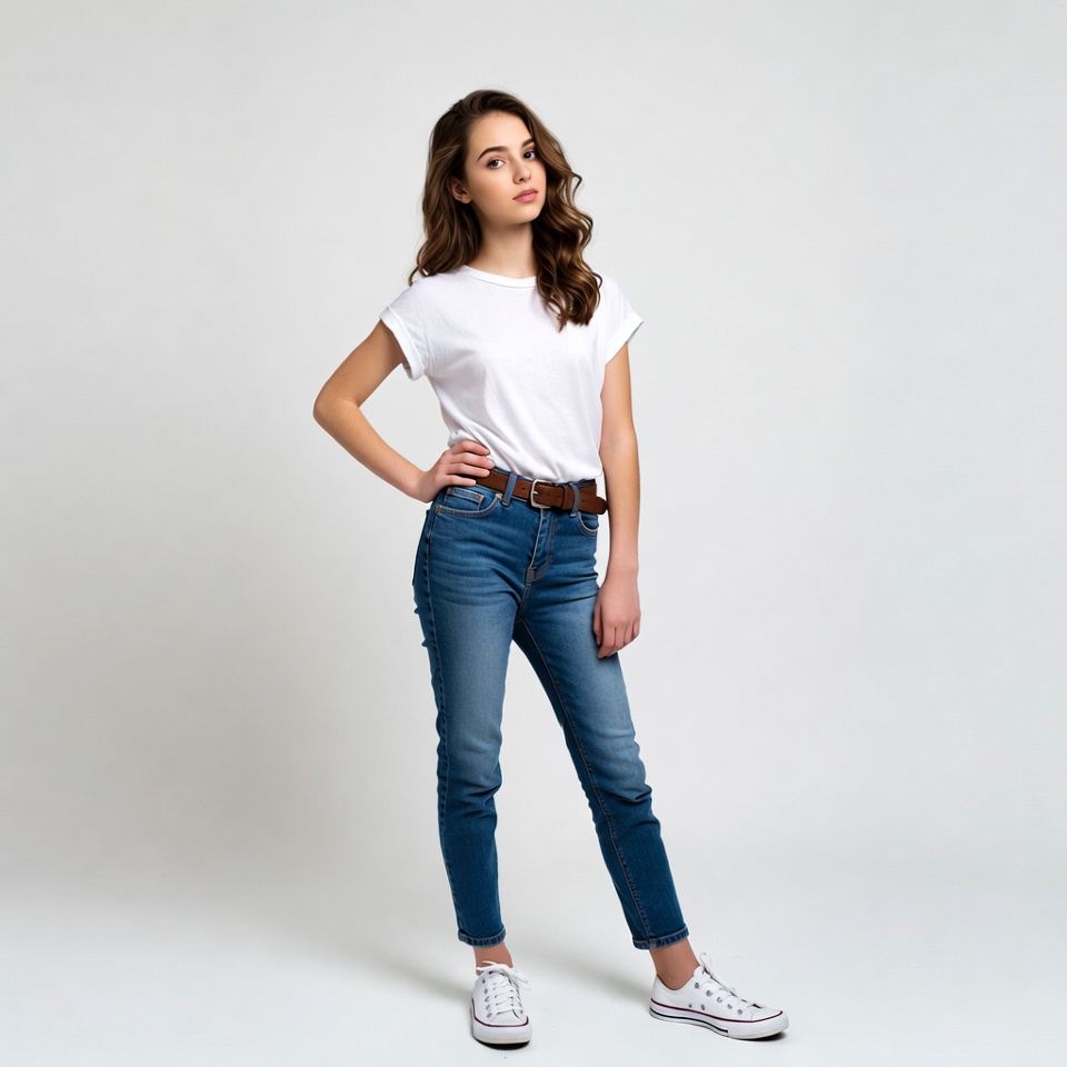 A teenage girl with wavy brown hair stands confidently with hands on hips against a plain white background. She wears a white short-sleeve t-shirt, light blue jeans, a brown belt, and white sneakers. She looks directly at the camera with a slight smile.