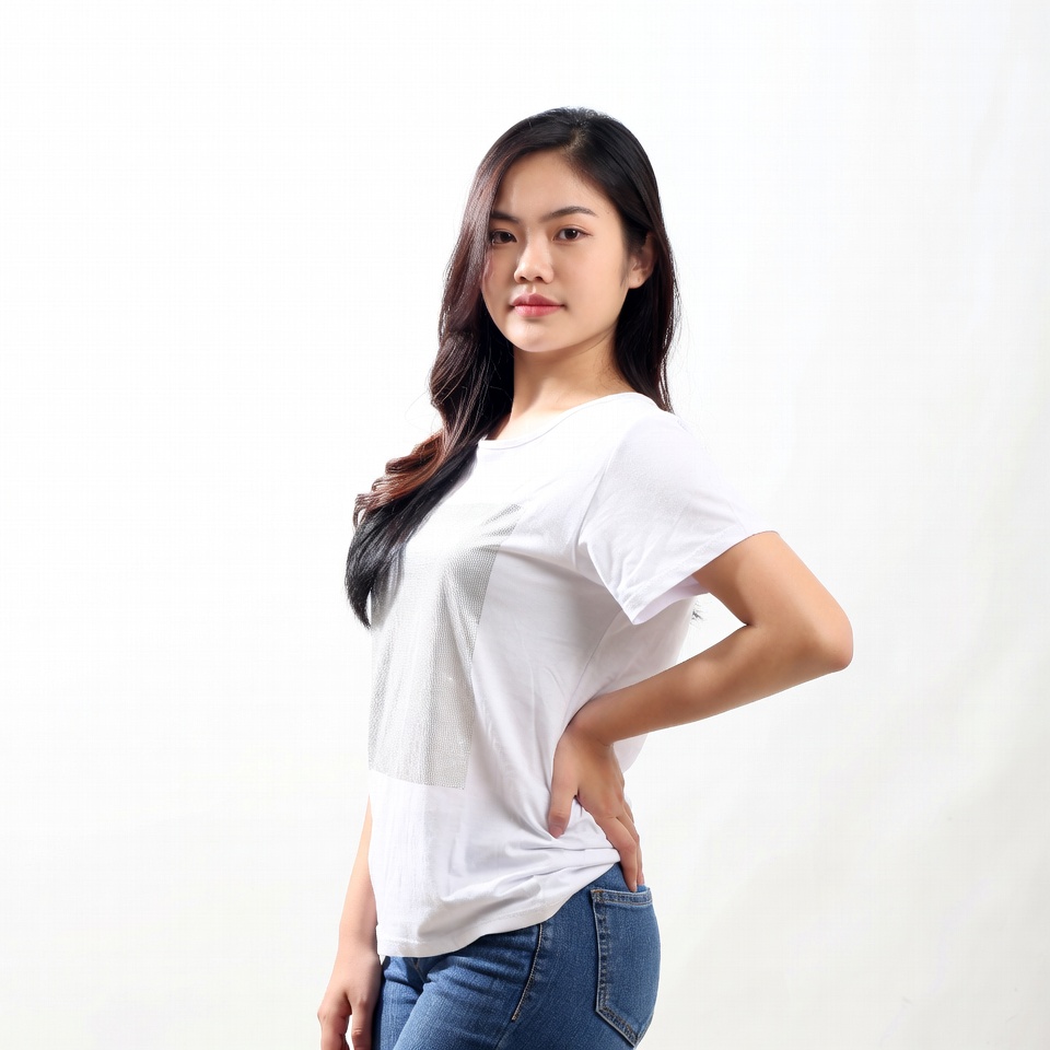 A young Asian woman with long dark hair stands in a side profile pose against a white background. She wears a white short-sleeved t-shirt tucked into blue jeans and rests one hand on her hip. Her expression is neutral and confident.