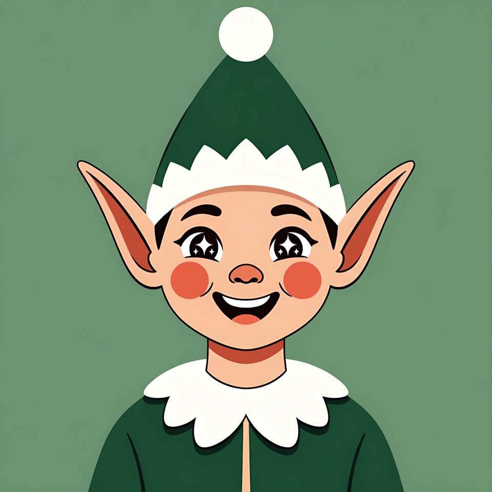 A cheerful cartoon elf boy with large pointy ears and green hat smiles at the viewer. He has rosy cheeks, big expressive eyes, and wears a green outfit with white collar and pom-pom on the hat. The illustration is set against a solid green background.
