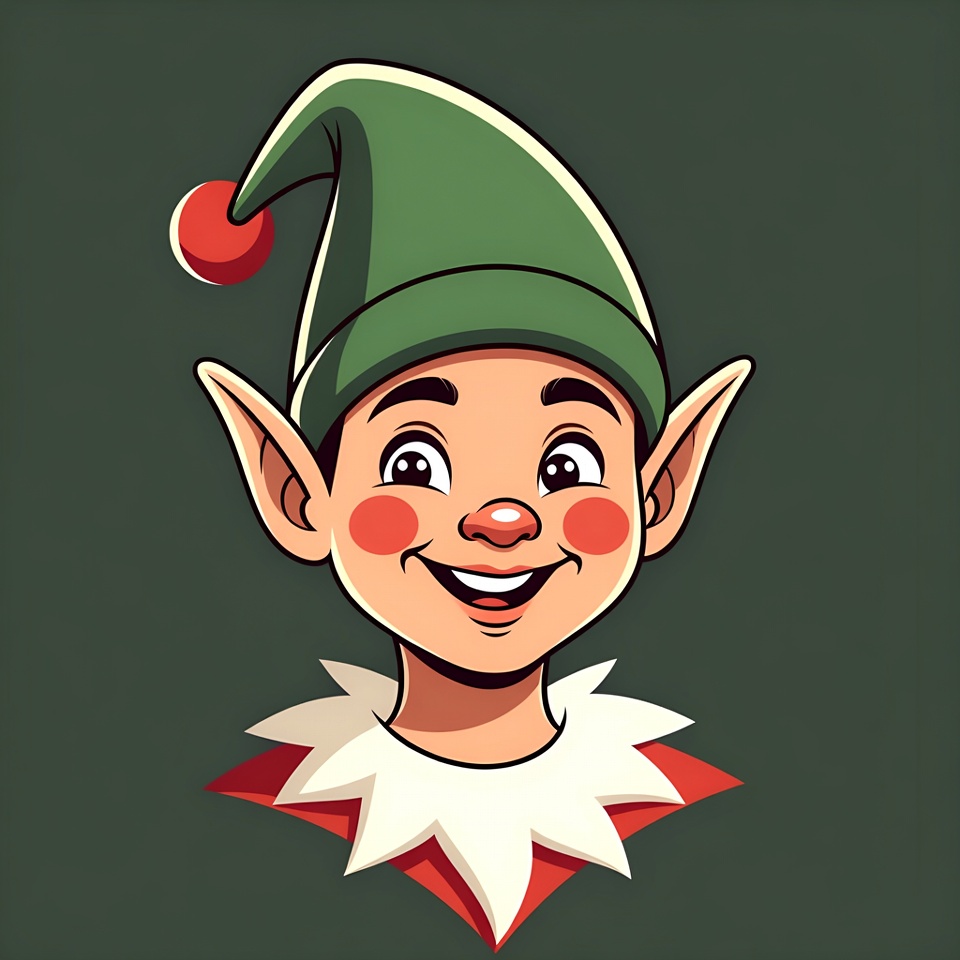 A cheerful cartoon elf with pointy green hat, red pom-pom, and large pointy ears smiles happily. The elf has rosy cheeks, a small red nose, and wears a white collar with red trim. The illustration is set against a solid green background.