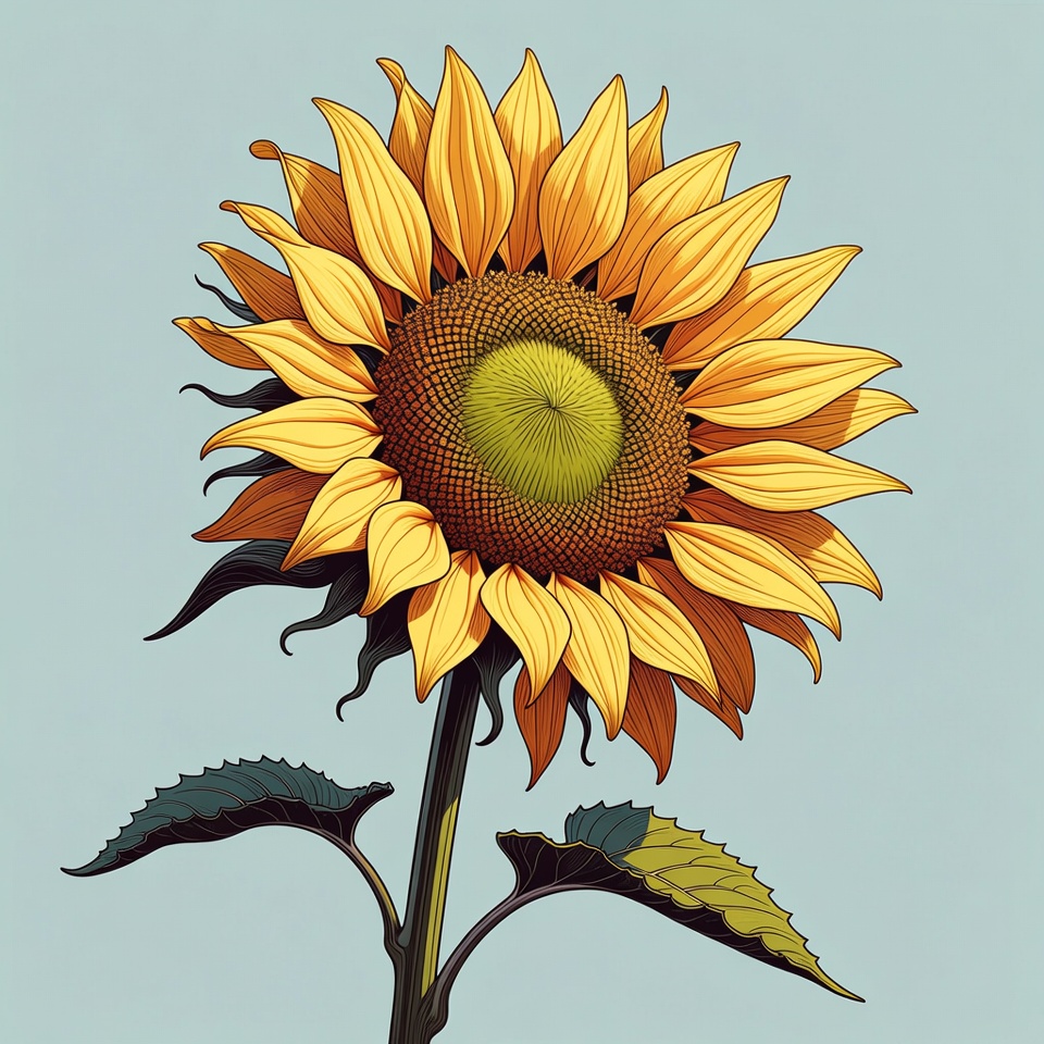 A detailed illustration of a bright yellow sunflower with numerous curved petals surrounding a textured brown and green center. The flower stands on a slender stem with dark green leaves. It is set against a light blue isolated background.