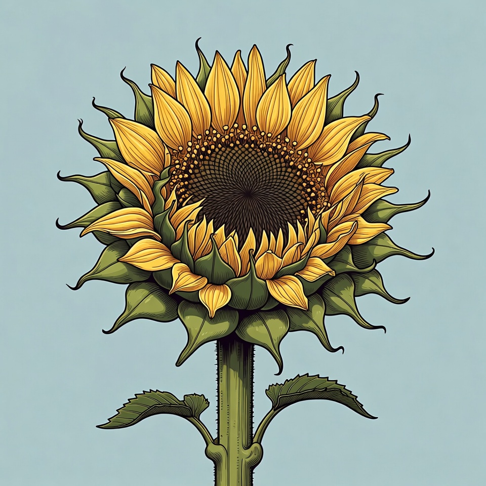 A vibrant illustrated sunflower features bright yellow petals surrounding a dark brown center. It stands on a green stem with leaves against a light blue background. The detailed line art emphasizes the flower's natural curves and textures.