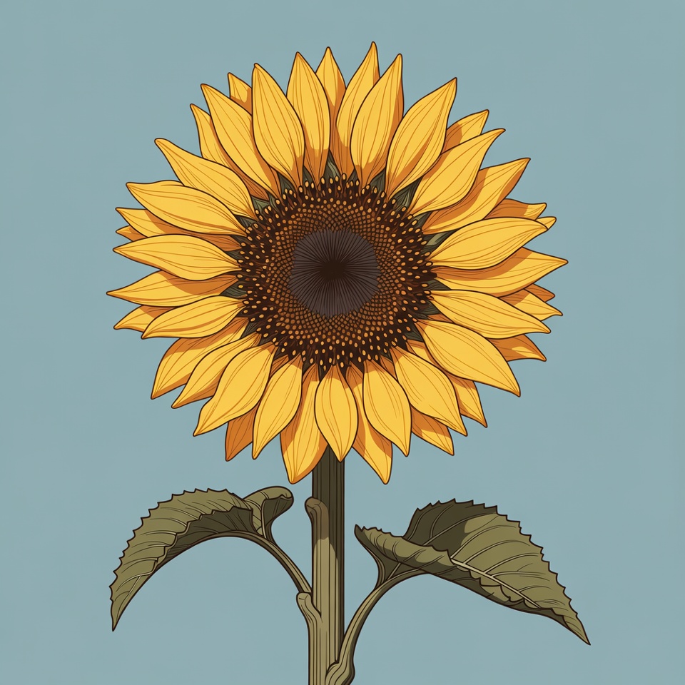 A vibrant yellow sunflower with detailed petals and a dark brown center stands on a green stem with broad leaves. The illustration features clean line art against a solid light blue background. The flower's petals radiate outward symmetrically.
