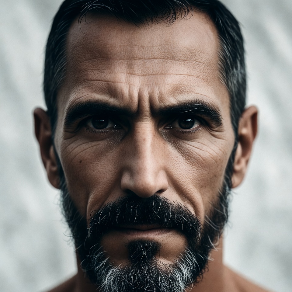 close-up portrait, dark hair, facial hair, furrowed brows, gray beard, intense stare, male, middle-aged, mustache, piercing eyes, rugged face, serious expression, short hair, white background, man