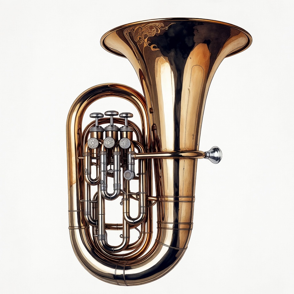 band instrument, brass horn, brass instrument, brass tuba, classical music, dragon engraving, gold tuba, isolated background, low brass, marching band, musical instrument, orchestra tuba, shiny brass, white background, tuba