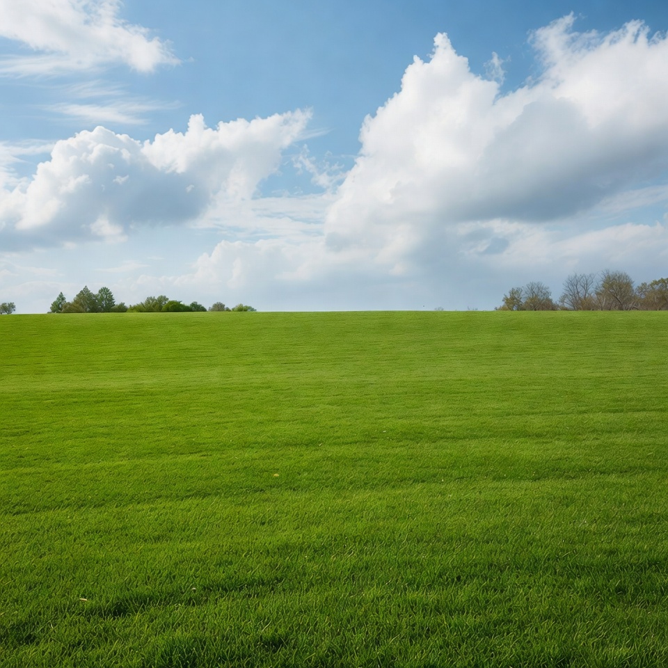 A vast green field stretches across the landscape under a bright blue sky. Fluffy white clouds dot the sky, and a line of trees appears on the distant horizon.