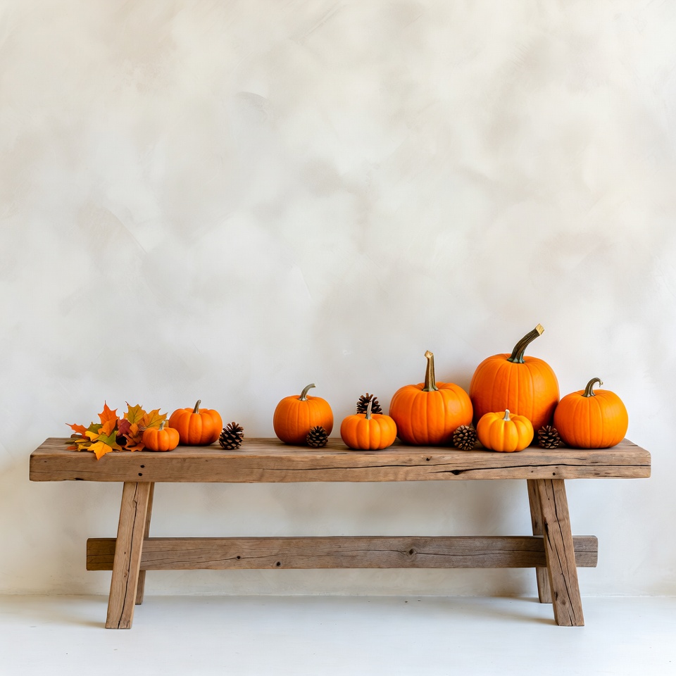 Various orange pumpkins of different sizes are arranged on a rustic wooden bench. Autumn leaves and pine cones are scattered among the pumpkins. The setup is against a plain white textured background.